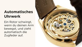 Automatikuhren, auch bekannt als selbstaufziehende Uhren, verfügen über ein mechanisches Werk, das sich selbst aufzieht, wenn du dein Handgelenk bewegst.