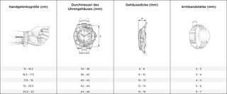 Verschiedene Elemente beeinflussen deine Uhrenwahl, darunter Handgelenkgröße, Gehäusedurchmesser, Gehäusedicke, Armbandstärke und Material.
