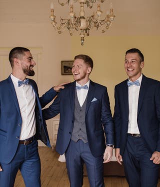 „Es ist immer einfacher, wenn der Bräutigam und seine Trauzeugen ihre maßgeschneiderten Anzüge bei derselben Firma kaufen, weil es ein stimmiges Gesamtbild ermöglicht. Das Gleiche gilt für die zusätzlichen Akzente - finde eine Firma, die Dir gefällt und kaufe dort ein."