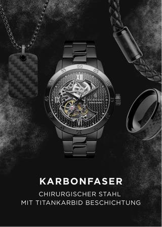 Edelstahl in chirurgischer Qualität und echtes Leder mit Karbonfaser-Highlights. Der Stahl ist mit Titankarbid beschichtet.