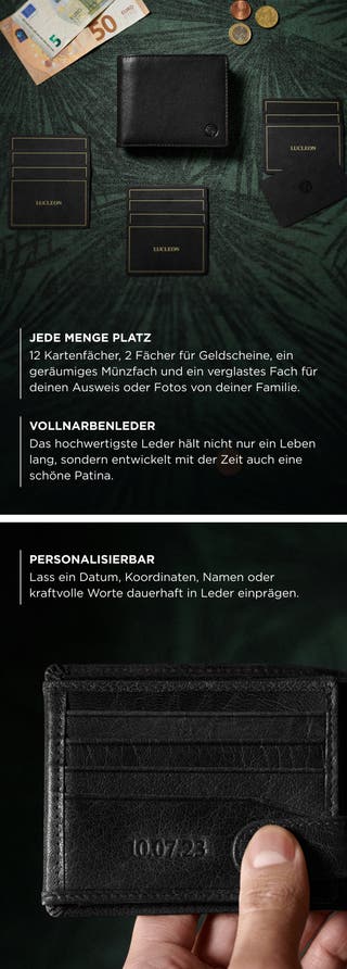 - Fasst bis zu 20 Karten, Bargeld und Belege